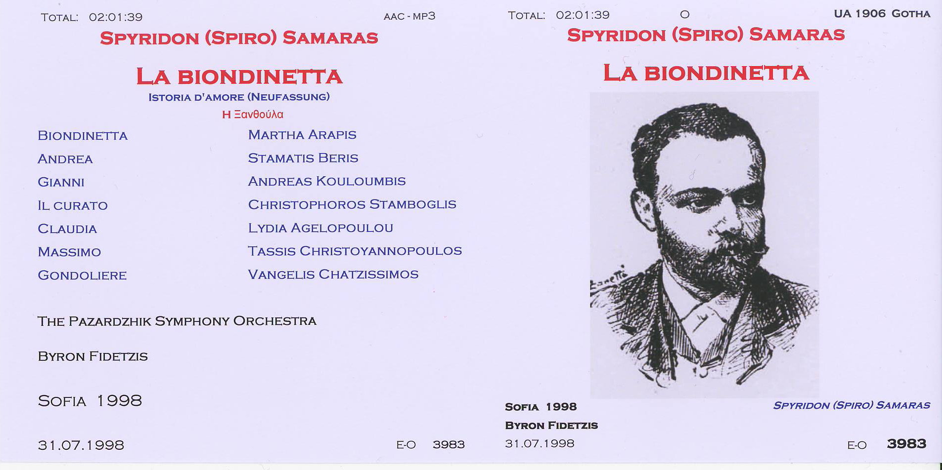 | LA BIONDINETTA The Pazardzhik Symphony Orchestra Cond. Byron Fidetzis Biondinetta - Martha Arapis Andrea - Stamatis Beris Gianni - Andreas Kouloumbis Il curato - Christophoros Stamboglis Claudia - Lydia Agelopoulou Massimo - Tassis Christoyannopoulos Gondoliere - Vangelis Chatzissimos - |