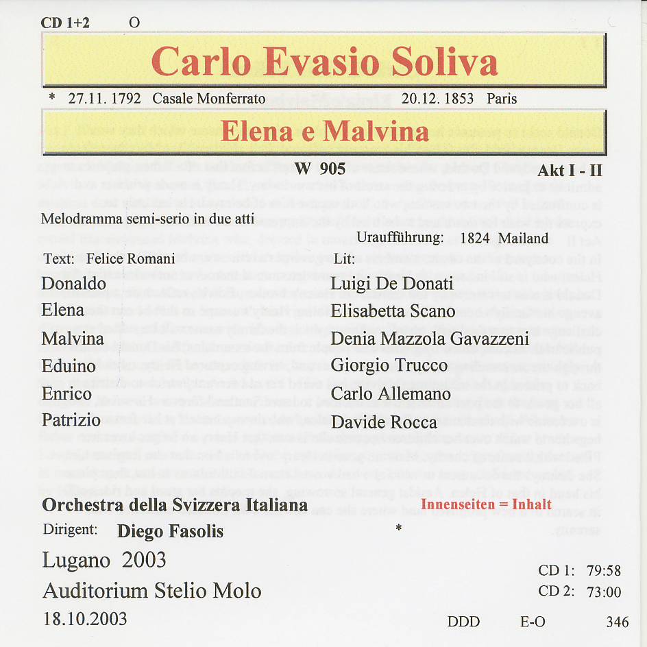 | Temporada de Ópera de Euroradio 2003/2004 Transmisión directa desde el Auditorium Stelio Molo de la Casa de la Radio de Lugano, en conexión con la Radio Suiza. 2003 Lugano Carlo Evasio Soliva Elena e Malvina Melodramma semi-serio in due atti Donaldo - Luigi De Donati Elena - Elisabetta Scano Malvina - Denia Mazzola Gavazzeni Eduino - Giorgio Trucco Enrico - Carlo Allemano Patrizio - Davide Rocca Orchestra della Svizzera Italiana Diego Fasolis |