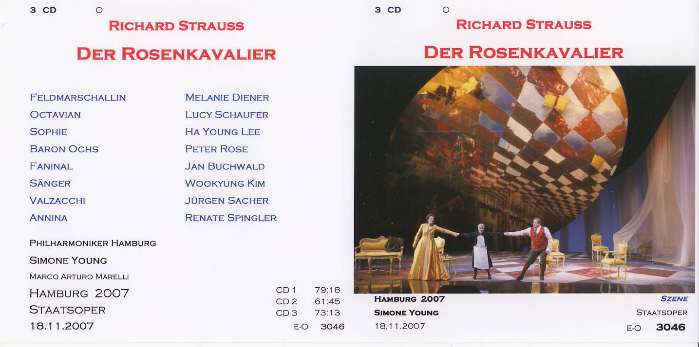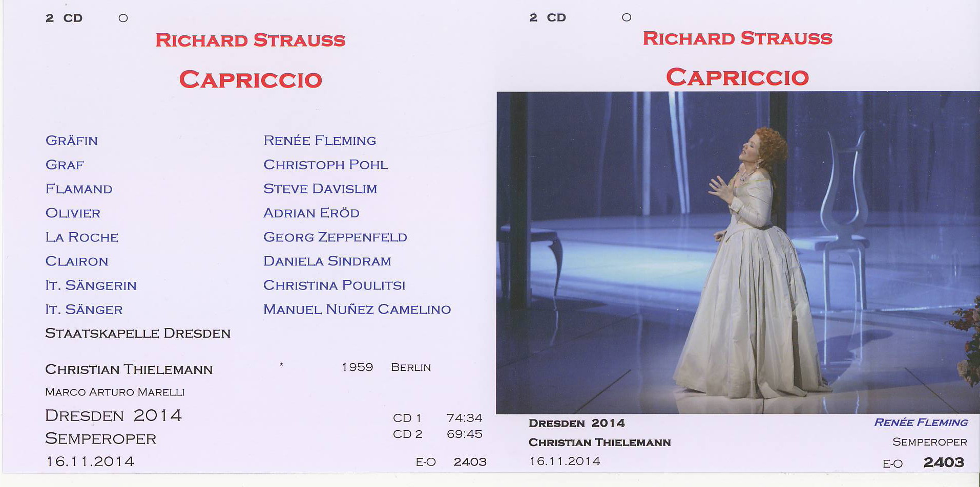 | CAPRICCIO Staatscapelle Dresden Cond. Christian Thielemann Gräfin - Renée Fleming Graf - Christoph Pohl Flamand - Steve Davislim Olivier - Adrian Eröd La Roche - Georg Zeppenfeld Clairon - Daniela Sindram It. Sängerin - Christina Poulitsi It. Sänger - Manuel Nuñez Camelino |