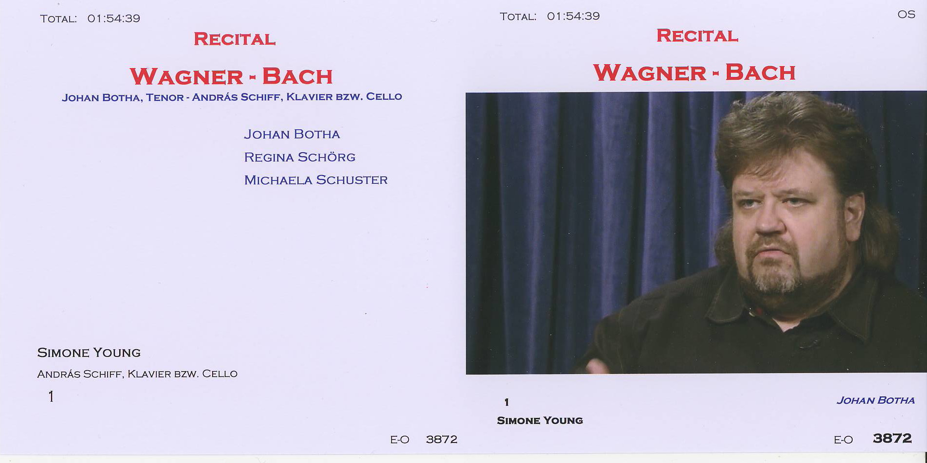 | Cantabile / Johan Botha, Tenor Richard Wagner: "Die Meistersinger von Nürnberg" Szene des Walther von Stolzing "Fanget an!" und Lied des Walther von Stolzing "Am stillen Herd in Winterszeit" aus dem 1. Aufzug; Preislied des Walther von Stolzing "Morgenlich leuchtend im rosigen Schein" aus dem 3. Aufzug (Johan Botha, Tenor; Radio-Symphonieorchester Wien: Simone Young); Johann Sebastian Bach: Französische Suite Nr. 3 h-moll, BWV 814 (András Schiff, Klavier); Richard Wagner: "Der fliegende Holländer" Szene Senta - Erik und Eriks Traum "Bleib Senta! Bleib nur einen Augenblick!" aus dem 1. Aufzug; Duett Senta - Erik und Kavatine des Erik "Was mußt' ich hören!" - "Willst jenes Tags du nicht dich mehr entsinnen" aus dem 3. Aufzug (Regina Schörg, Sopran; Johan Botha,Tenor; Radio-Symphonieorchester Wien: Simone Young); Johann Sebastian Bach: Suite Nr. 1 G-dur, BWV 1007 (Heinrich Schiff, Violoncello); Richard Wagner: "Lohengrin" Gralserzählung des Lohengrin "In fernem Land, unnahbar euren Schritten" aus dem 3. Akt; "Parsifal" Szene des Parsifal "Nur eine Waffe taugt" aus dem 3. Aufzug (Johan Botha,Tenor; Radio-Symphonieorchester Wien: Simone Young); Johann Sebastian Bach: Französische Suite Es-dur, BWV 815 (András Schiff, Klavier); Richard Wagner: "Die Walküre" Lied des Siegmund "Winterstürme wichen dem Wonnemond" aus dem 1. Aufzug (Michaela Schuster, Sopran; Johan Botha, Tenor; Radio-Symphonieorchester Wien: Simone Young) |